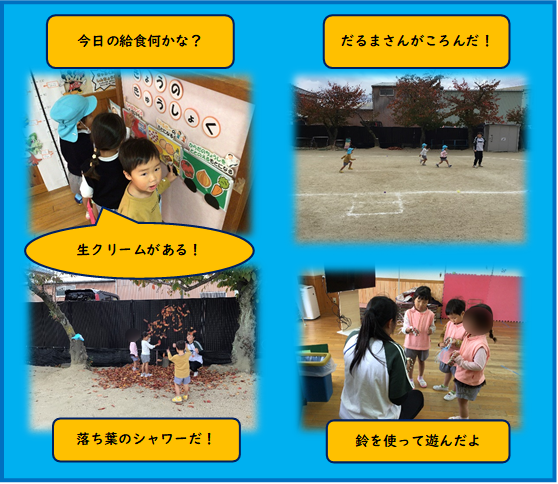 幼稚園には、落ち葉がいっぱい!うさぎ組の子どもたちは、落ち葉をたくさん集め落ち葉のシャワーをしたり、だるまさんがころんだをして遊びました。