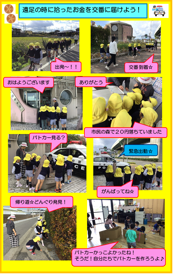 お金を拾ったことで、交番に届ける体験や警察官の方と触れ合う体験ができた子どもたち☆