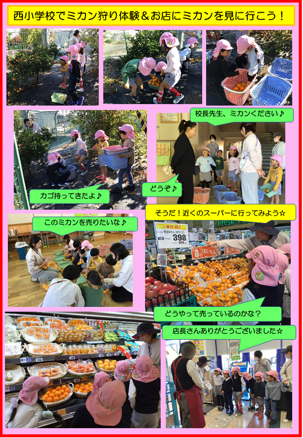 はな組の子どもたちは、朝から西小学校の果樹園にある黄色くて美味しそうなミカンをたくさん収穫させていただきました。