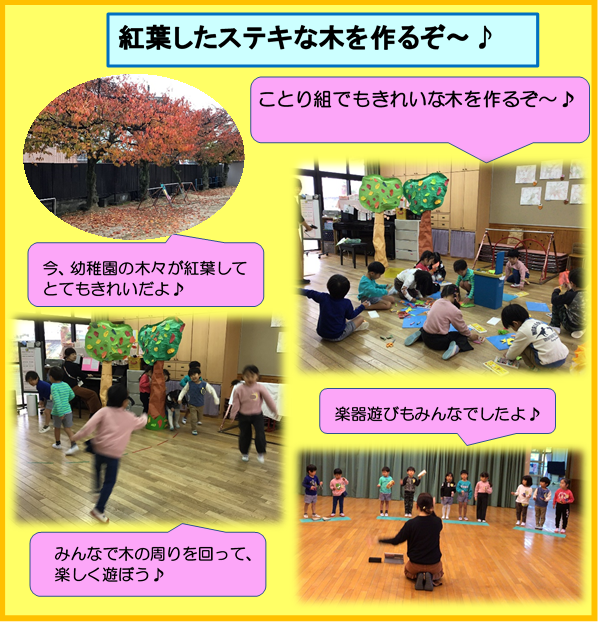 園庭の桜やイチョウなどの木々が赤や黄色に色づき、あまりの美しさに朝から感動しました♪
