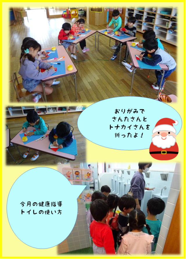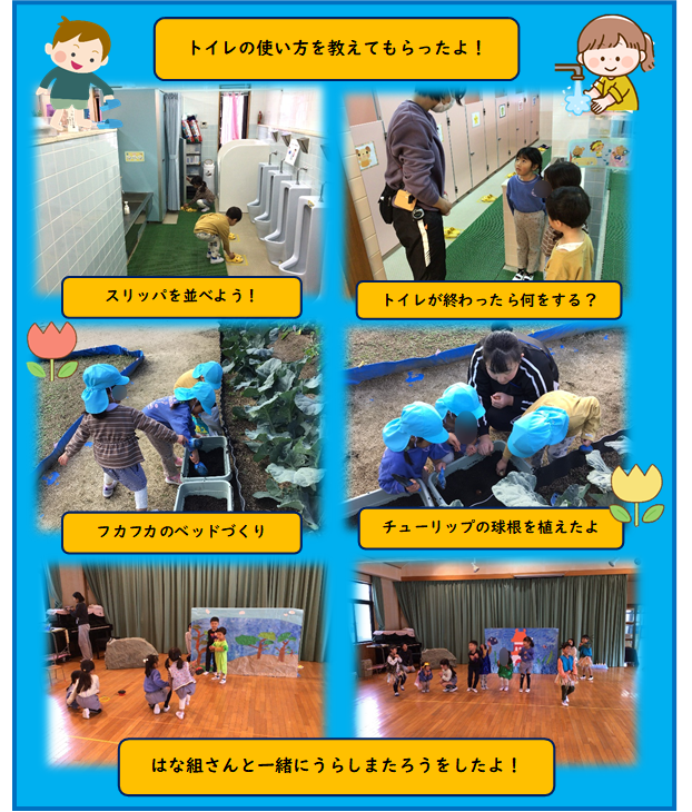 今月の身体測定後の養護教諭による保健指導では、トイレの使い方(スリッパをそろえる・トイレをきれいにしよう)・トイレ後の手洗いなどの話を聞きました。トイレの使い方について再確認できた良い機会となりました☆