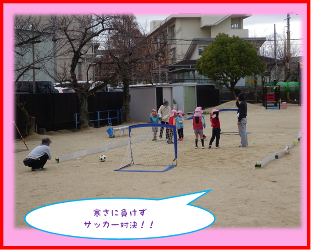 子どもたちは寒さに負けず、園庭ではサッカーをしたり、チューリップの球根を植えたり・・・。