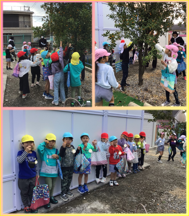 そして鏡餅の上には本来、橙を飾るのですが、幼稚園にはないので、西小学校でたわわに実っているキンカンを分けていただくことにしました。「どうぞどうぞ♪」と快く分けてくださる小学校の先生方☆いつも西幼稚園の教育にご理解、ご協力をいただきまして、本当にありがとうございます♪