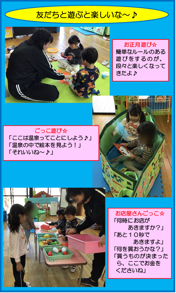 ごっこ遊びも大好きで、「わたしがお母さんね♪」「ここは温泉にしよう♪お湯がいっぱいになったよ~」「お風呂で本を読もう♪」「お店屋さんもできたよ~」「もう少しでお店があきま~す」など、自分の思いをいっぱい出しながら友だちと一緒に遊んでいる子どもたち☆