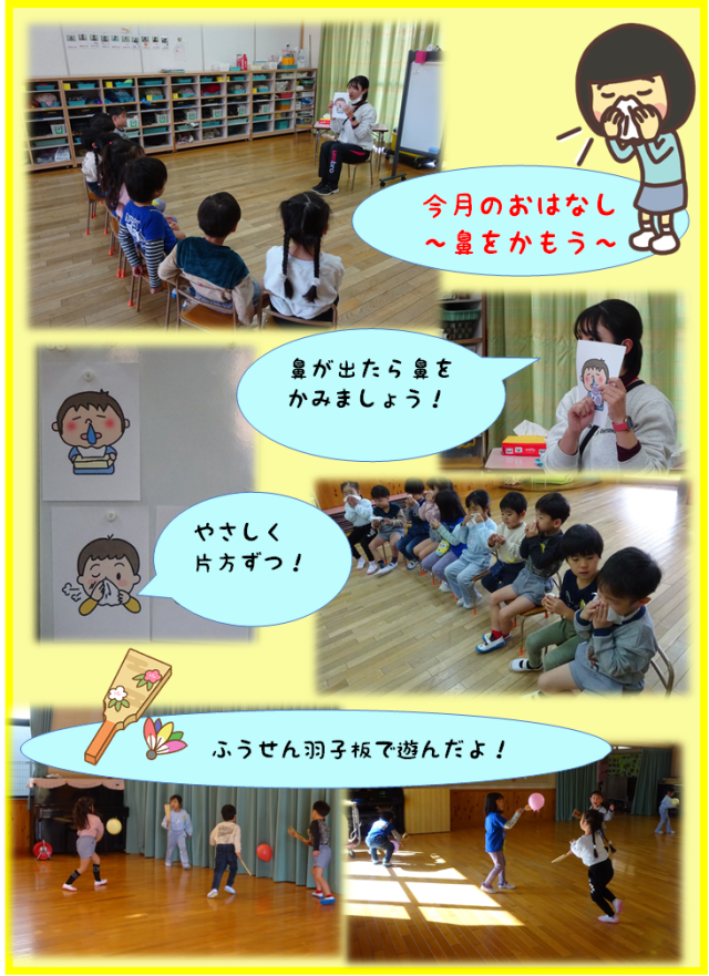 そして今日は身体二測定の時、養護教諭の先生から『鼻のかみ方』を教えてもらいました。まだまだ風邪などが流行する時期です。鼻水が出た時は、片方ずつ優しく鼻をかむ方法をぜひ実践してみてくださいね。