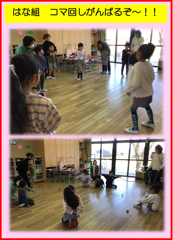 ダルマ落としでは、何度失敗してもできるまでやってみようとする様子、コマ回しでは友だちとどちらが長く回るか対戦し、「負けても次は頑張るぞ!」と何度も繰り返し勝負する姿など、いろいろな遊びの中で子どもたちの心の育ちがたくさん見られます。