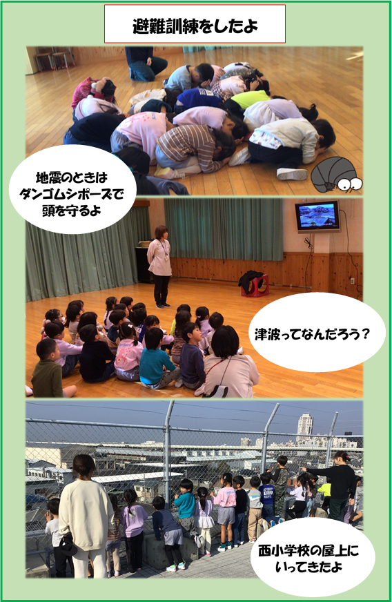 昨年度の津波の避難訓練で、西小学校の屋上に上がったことを、ことり組とはな組の子どもたちは覚えていたようです。