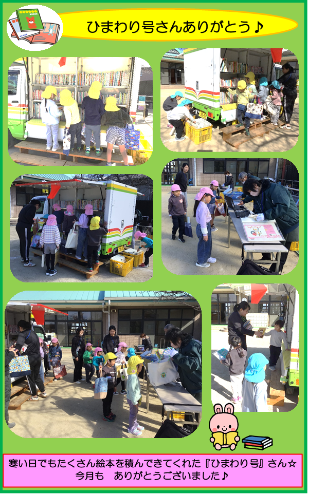 そんな天気の中でも、貝塚市民図書館より『ひまわり号』が絵本や紙芝居をたくさん積んでやってきてくれました☆