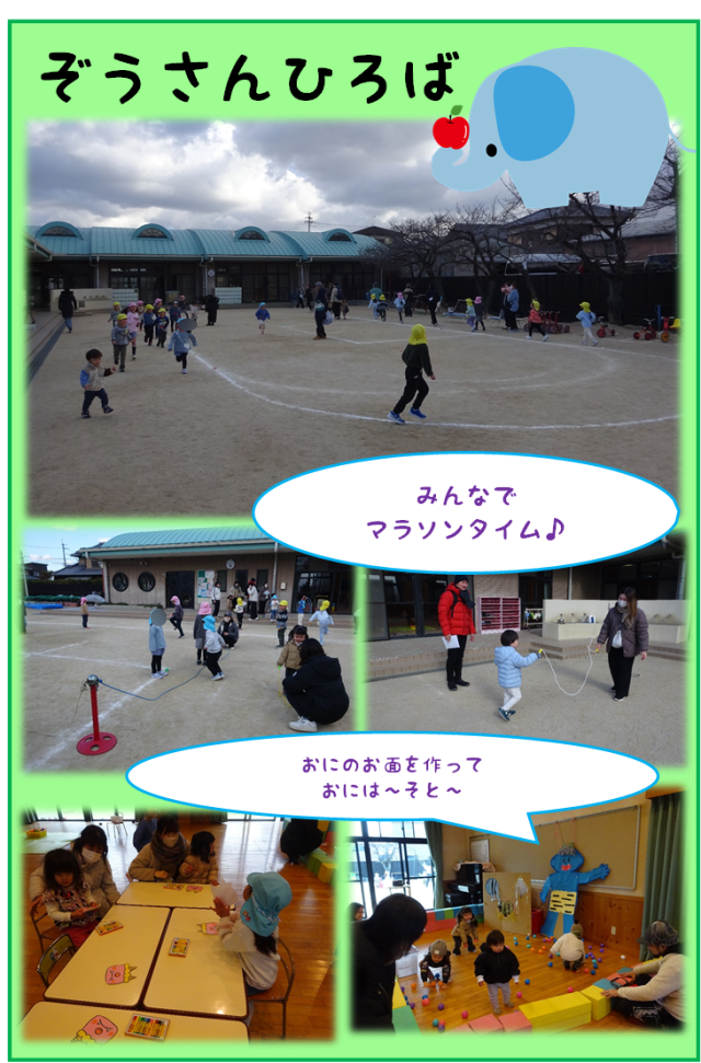 今日のぞうさんひろばは、寒さに負けないように一緒にマラソンしたり、縄跳びやなみなみ大繩を一緒にしました。