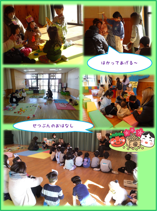 体があったまった後は、朝から子どもたちが考えたコーナー遊びを一緒にしたり、節分の鬼のお面を作ったり・・・