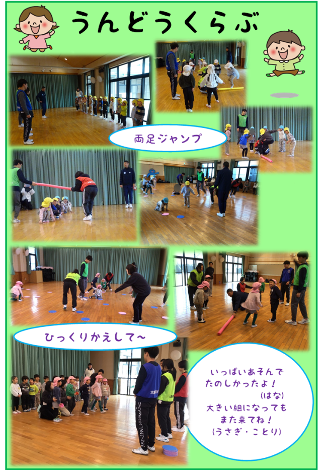 ことり組とうさぎ組は、また来年度も『うんどうくらぶ』がありますよ~♪みんなでおもいきり体を動かして遊びましょうね☆