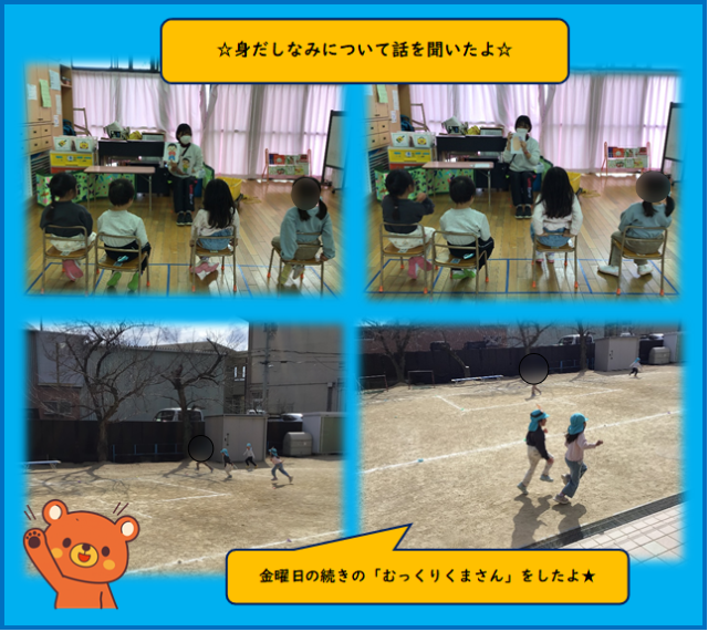 朝から「むっくりくまさんやりたい!」と言っていた子どもたち。金曜日にしたのが、よほど楽しかったのでしょう…♪今日、外に出る時「むっくりくまさん、むっくりくまさん~♪」と楽しそうに歌を口ずさみながら靴を履いていて、「早くやりたい!」という気持ちが体中からあふれ出ていました!