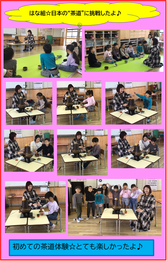 今日の体験は、きっとはな組の子どもたちの心に残り続けることと思います♪子どもたちに愛情をもってご指導いただいた茶道の先生に、心から感謝しております。本当にありがとうございました。