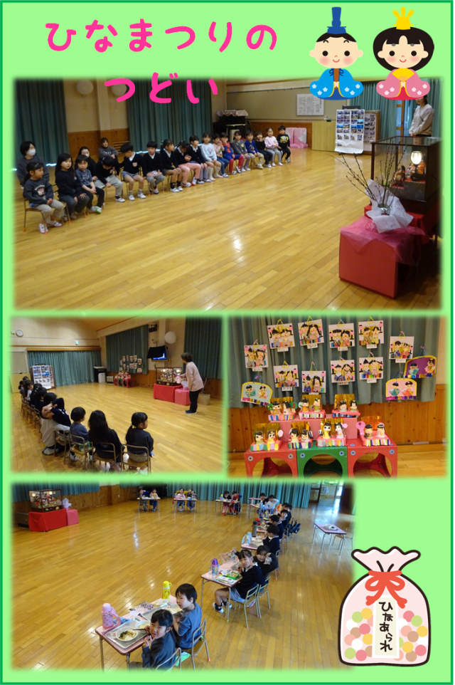 つどいの後は、お雛様と西幼稚園のみんなでホールで給食をたべました。