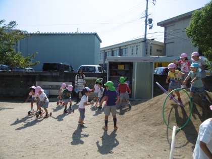最初は4歳・5歳の在園児と一緒に、砂場やフープなど園庭で思い思いの遊びを楽しみました。後半は、10月にある運動会の為に、体操を一緒にしたり、2つのグループに分かれた玉いれやかけっこを楽しみました。