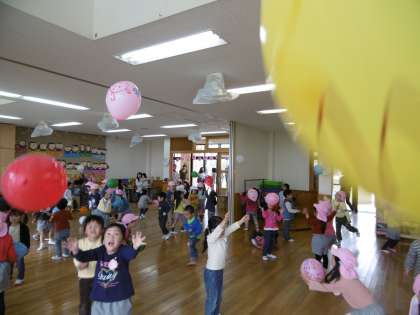 今日は、少しでも幼稚園生活になれ4月をむかえられるように、幼稚園の生活の一部を体験し、園庭で遊んだり、保育室で朝の挨拶や歌、絵本をみたり、リズム遊びやふれあい風船遊びをしました。