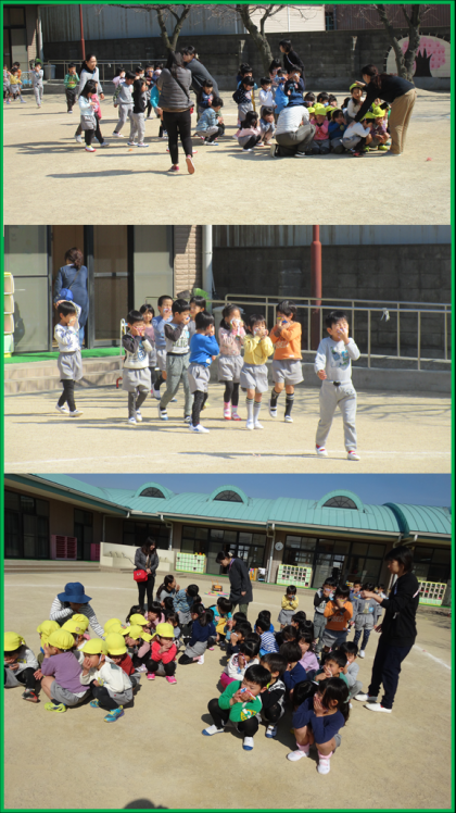 園庭やクラスで遊んでいる時間に、『火事です!火事です!園庭に出ましょう』