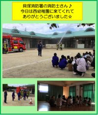 貝塚消防署の人と一緒に火災の避難訓練をしたよ☆ 今日は貝塚消防署の消防士さんが...