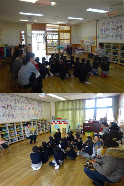 最後の読み聞かせは、お家の人も一緒に参加。 楽しいお話の世界に引き込まれていまし...