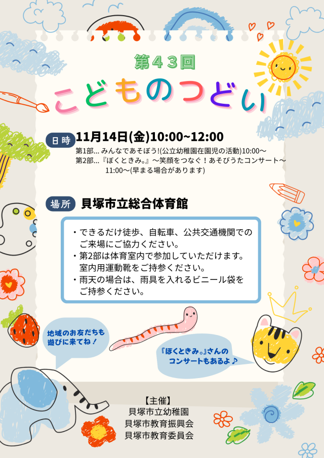 11月14日(金)貝塚市総合体育館に貝塚市の公立幼稚園4園の子どもたちが集まり、『こどものつどい』をします。