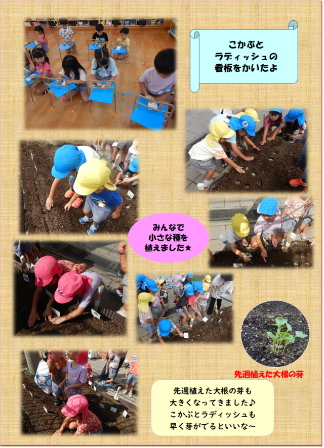 体を動かして遊んだ後は、小蕪とラディッシュの種を植えました。