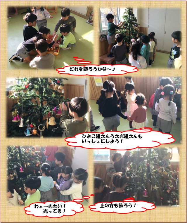 年長さんが飾ると、3・4歳児も呼びに行き優しく声をかけながら