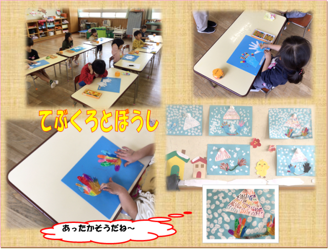 年中さんは、明日から雪が降るかも・・とあったかい手袋と帽子を描きました。