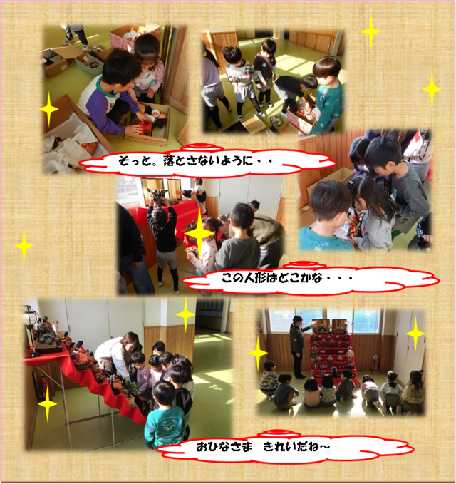 朝から年長さんが、幼稚園のひな人形を飾ってくれました。