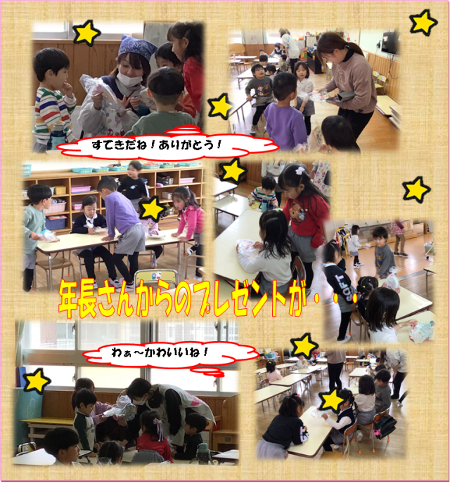 笑顔で渡す年長さん。もらった子どもたちもニッコリとても喜んでいました。