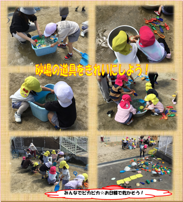 園庭では鬼ごっこを一緒にしたり、最後は砂場道具もみんなできれいに洗いました。