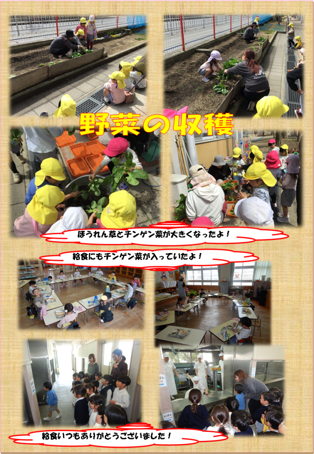 畑の野菜もグングン大きくなり、今日は収穫できました。お家でどんなお料理に変身するのかな?