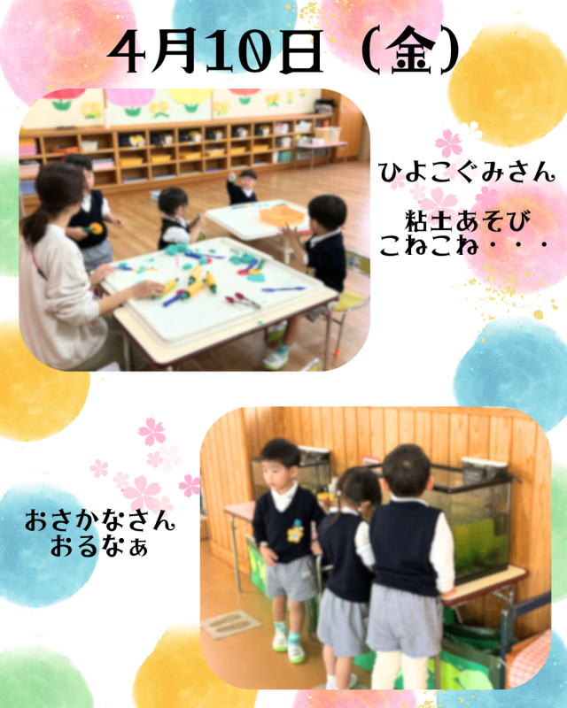ひよこぐみさん、幼稚園の中を探検したり、粘土遊びを楽しんだり・・・。笑い声がたくさん聞かれましたよ。