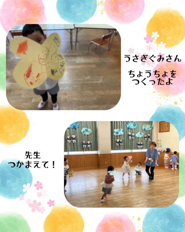 うさぎぐみさん、ちょうちょのおもちゃを作って遊びました。パタパタと飛びまわらせて、幼稚園中の花の蜜を飲ませてあげるうさぎぐみさんでした。