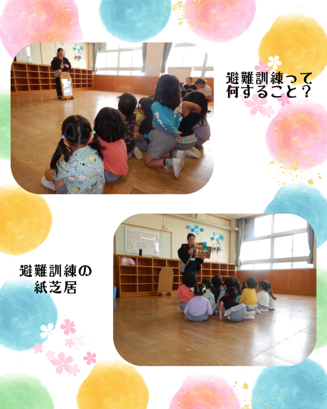 今日はその避難訓練の日。入園したばかりのひよこさんにもわかるように、「避難訓練って何?」という話をしました。これから1年かけて、火事や地震、洪水や津波など、幼稚園にいるときに危ないことが起こった場合の自分の行動の仕方を知っていきます。こあらさんやうさぎさんは、さすが去年、一昨年と積み重ねがあるので、いろんなことをよくわかっていました。
