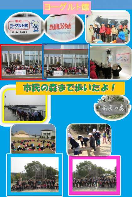 年長児は幼稚園最後の遠足だったので、年少児と年長児がペアーになってヨーグルト館に行きました。