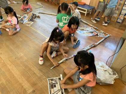 年長さんは、朝から広告や新聞紙を使って迷路作りを楽しんでいました。