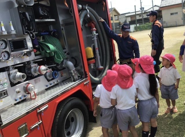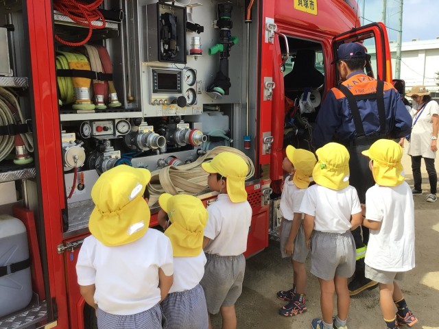 ピカピカの消防車に、たくさんのホースや道具があるので、子どもたちは「これは何ですか?」「どんな時に使うの?」と次々に質問。消防士さんも優しく答えてくださいました。