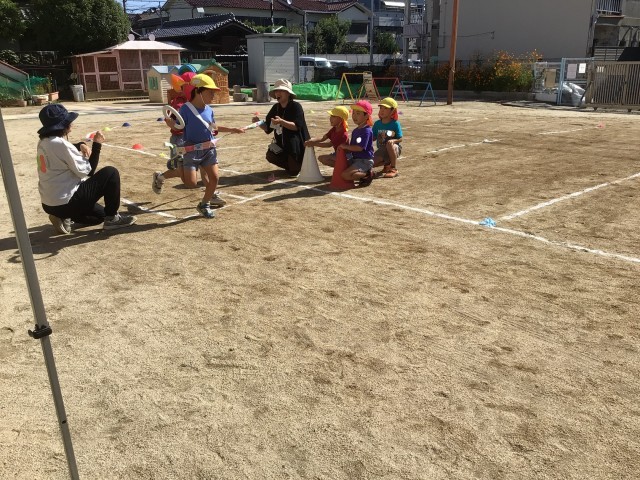 かけっこやリレーでは、力いっぱい走る姿が見られました。ゴールまで走りきると「もう一回したい」と、意欲満々の子どもたちでした。