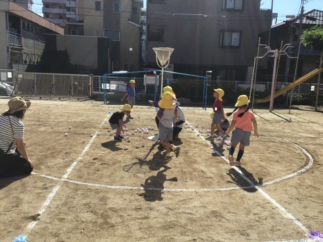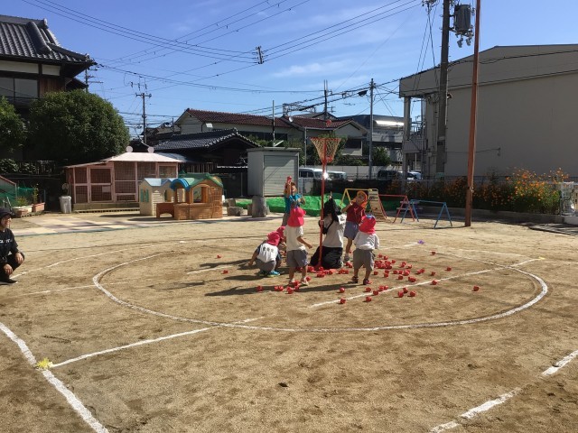最初は赤白対抗の玉入れです。かごをめがけて「それ~!」と力いっぱい玉を投げる子どもたち。入るたびに「やった~!」と歓声が上がります。今日は赤チームが勝ったのですが、勝っても負けても「楽しかった!」と笑顔いっぱいの子どもたちでした。