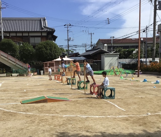 竹馬や一本歯げたでは、乗る時はバランスをとるのが難しいのですが、何度も挑戦して長く歩けるようになってきました。
