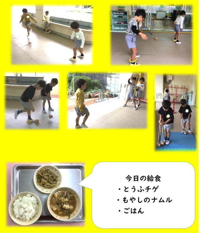 運動会後も体を動かして遊ぶことが大好きな、ほし組の子どもたち!新しい遊具や大繩など友だちと一緒にすることを楽しんでいます。何度もチャレンジし、自分なりにコツをつかみ成功することで「楽しい!!」「もう一回やってみる!」「面白いなぁ」…と数を数えたり、友だちと競い合ったり、自分なりの挑戦を楽しんだりなど、繰り返す姿が見られます。また明日も続きを楽しみにしている子どもたちです。