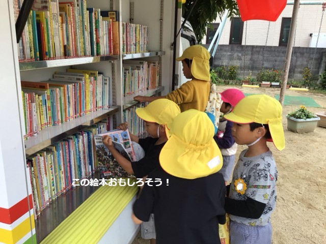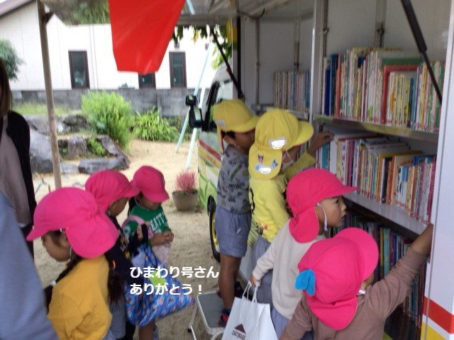 今日はひまわり号さんが来てくれました。自分の好きな絵本をじっくりと選んだり、友だちと楽しそうに話をしながら選んだり・・・。
