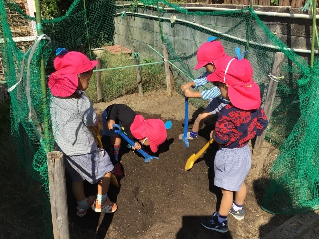 「いいにおい!」「やわらかくなってきたね」と、夢中でスコップを動かす子どもたち。