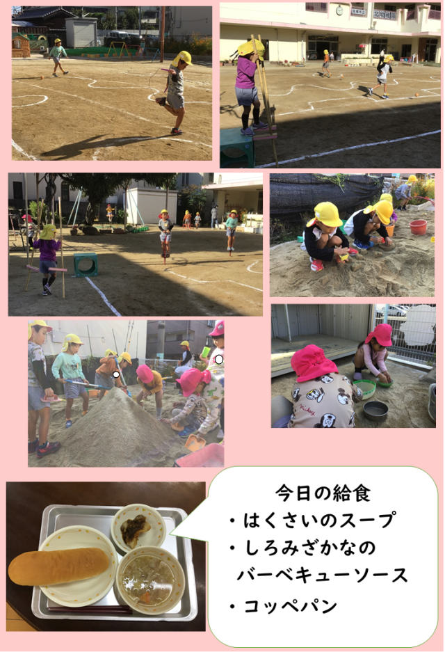 運動会後ものびのびと体を動かして存分に楽しんでいる子どもたちです。縄跳び、ホッピング、竹馬など…チャレンジする気持ちがさらに高まっています。そして、友だちと一緒に力を合わせるからこそ楽しい気持ちも湧いています。