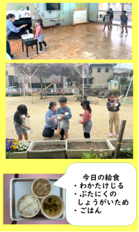 そして、今日はお弁当の日。「何が入ってるかな」「いっぱい食べよう」「お弁当早く食べたい」と朝から楽しみにしている子どもたち。