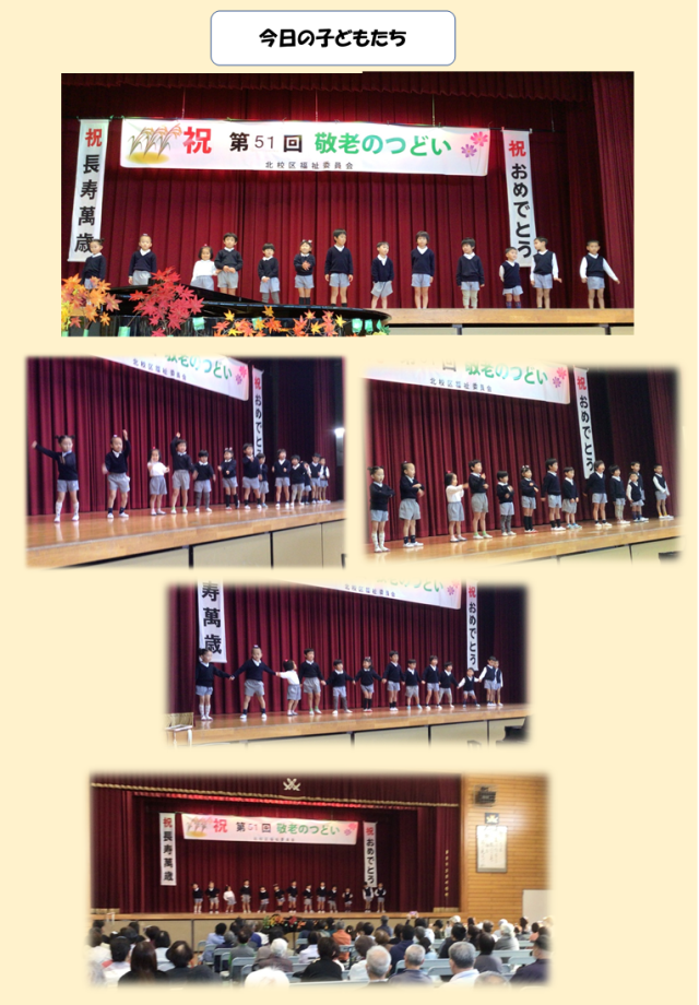 今日は、北校区福祉委員会主催の『第51回敬老のつどい』に参加させていただき、北小学校の体育館の舞台で発表をしてきました。