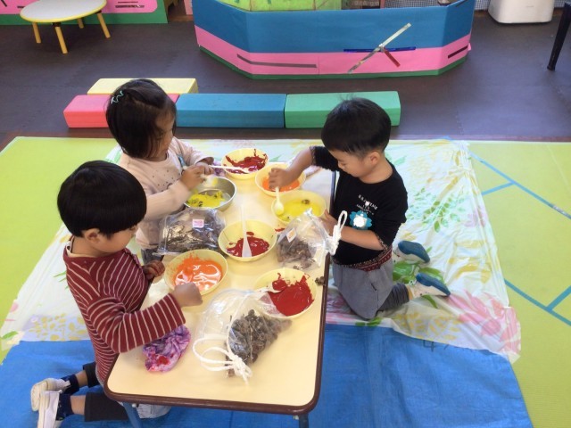にじ組さんは、どんぐりを使った絵の具遊び。どんぐりに好きな色を付け、画用紙の上に転がすと、面白い線や模様がどんどん広がります。「みてみて!」「ぐるぐるになった」「迷路みたい」と、転がるたびに変わる形にワクワクしていた子どもたち。秋ならではの素材に触れながら遊ぶことを楽しみました。