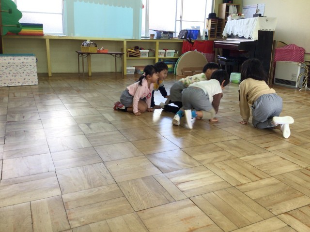 はな組さんは、犬や猫など、いろいろな動物になりきって表現遊びを楽しみました。「犬はどんなふうに歩くかな?」「ネコは肉球を見せて歩くんだよ」など、友だち同士イメージを膨らませながら、思い思いにポーズや動きを工夫。四つん這いになったり、跳ねたりなど、たくさんの面白い動きが生まれていました。