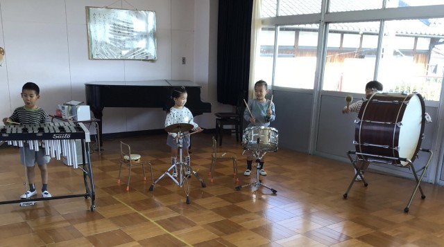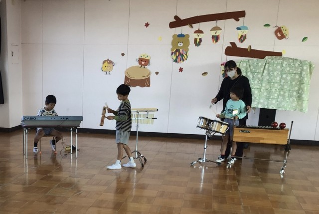 ほし組さんは、今日は❝音の世界❞を楽しみました。木琴や鉄筋、キーボード、大太鼓、シンバルなど、いろいろな音程のある楽器や打楽器を使って音の違いを感じてみると「高い音」「こっちはふわっとした音がする」と、子どもたちからたくさんの発見の声が!友だちと音を合わせて見たり、自分だけの音を探したりしながら、楽器の面白さをたっぷり味わっていました。