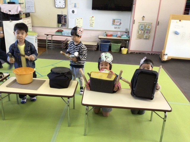 自分の音を確かめるようにたたく子、音に合わせてたたく子など、いろいろな姿が見られました。